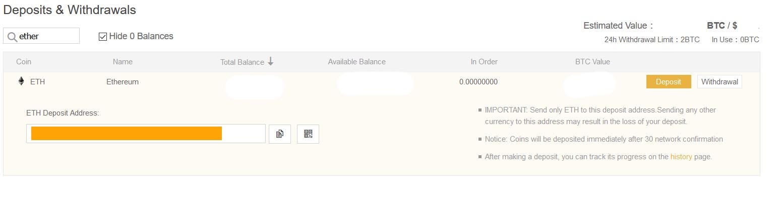 4. Type Ether in search bar and then click deposit. Copy the ETH Deposit Address. Copy whole of the address carefully and transfer your coin from your ether wallet to Binance wallet.